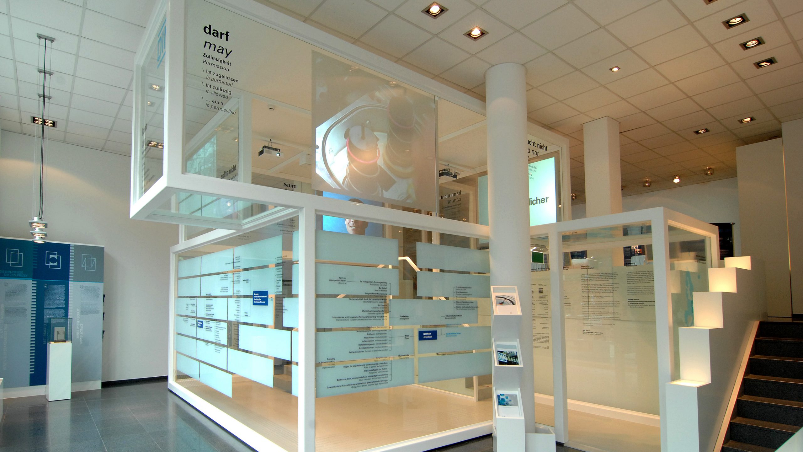 In einer fiktiven Stapelung von vier Standardcontainermodulen, proportional an die vorgegebene Raumsituation angepasst, wurde die Form einer Gitterstruktur mit gläsernen Wänden als Spielflächen und zugleich als Metapher für die Transparenz der Arbeit des DIN entwickelt. Praktisch verbindet die Transparenz durch die optische Aufhebung der Trennung von „Innen“ und „Außen“ die unterschiedlichen Medienereignisse und somit Bedeutungsebenen miteinander.